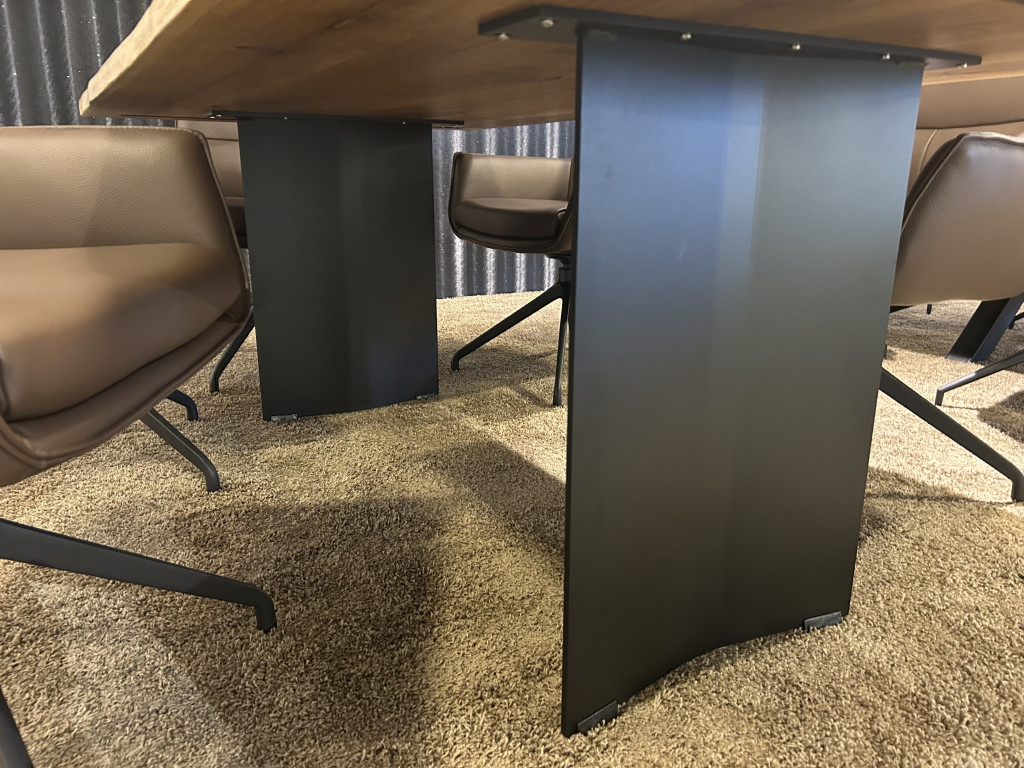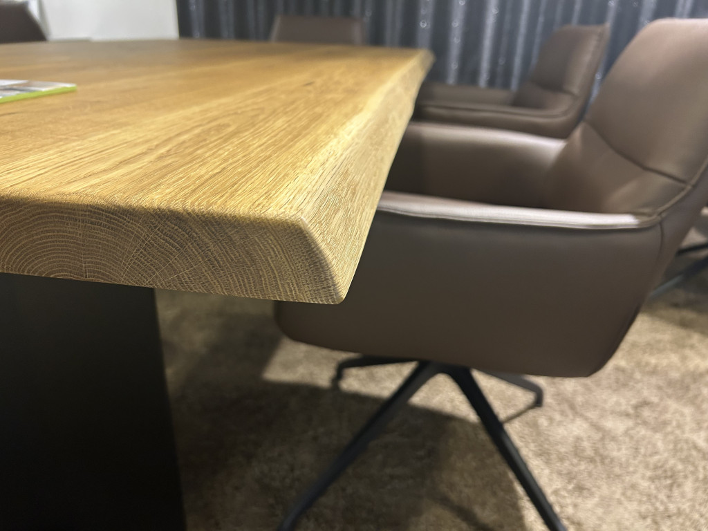 Die 4 cm starke Tischplatte aus massiver Eiche überzeugt durch ihre natürliche Charakteristik mit ausgefüllten Ästen und Rissen. Die Oberfläche ist natur geölt, was die markante Maserung besonders edel zur Geltung bringt. Ein besonderes Highlight ist die echte Baumkante, die jedem Tisch eine individuelle Note verleiht. Das moderne Untergestell aus schwarzen, geknickten Stahlwangen bildet dazu einen kraftvollen, zeitgemäßen Kontrast.