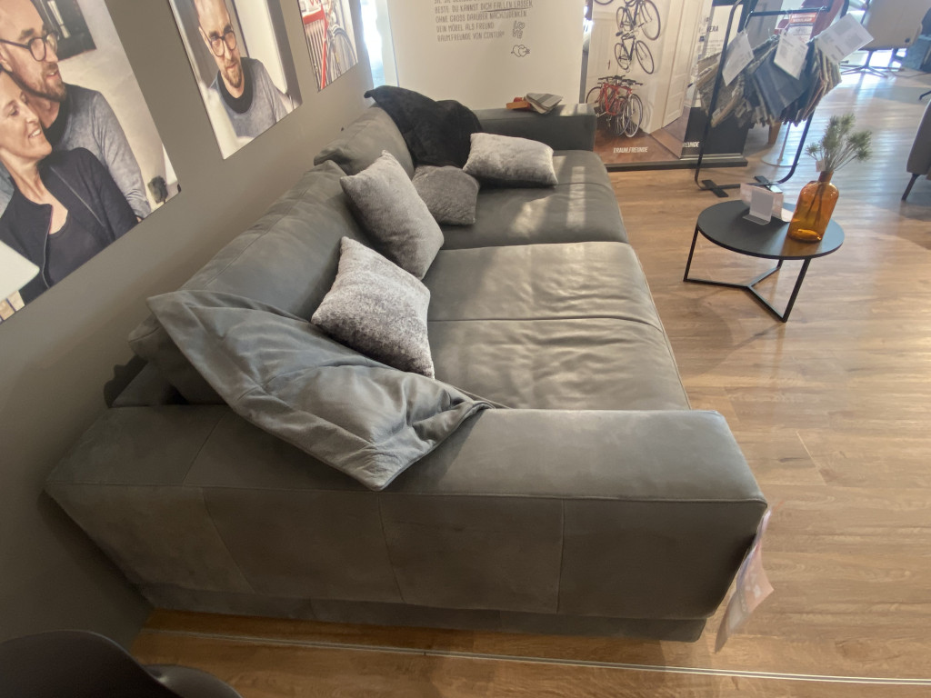 Das Sofa ist mit dem exklusiven Leder Movini in einem edlen Anthrazit bezogen. Für einen besonderen Sitzkomfort sorgt der hochwertige Sandwich-Sitz, der zum Verweilen einlädt. Die moderne Linienführung wird durch die dezente Armlehne (Variante 1) perfekt ergänzt. Mit einer Breite von ca. 292 cm bietet es großzügigen Platz für entspannte Stunden.