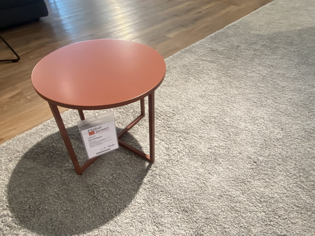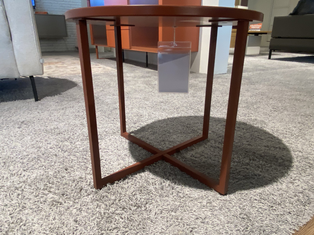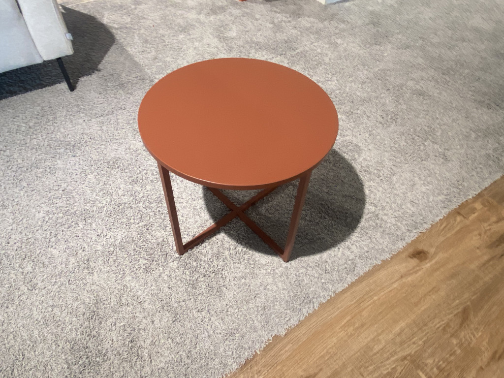 Tischplatte und Metallgestell sind in einem markanten Oxidrot gehalten, was dem Tisch eine charakterstarke und zeitgemäße Optik verleiht. Dank der runden Form und der kompakten Maße (ca. 40/45/45 cm) lässt er sich flexibel in verschiedene Wohnsituationen integrieren.